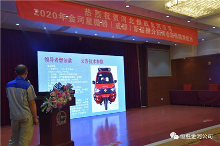 8月8日下午14:00河北恒勝金河公司2020年金河星微轎(成都)新品推介招商會(huì )在成都石化國際酒店三樓長(cháng)盛廳順利召開(kāi),來(lái)自南方各區域的新老客戶(hù)前來(lái)參加,首先公司總經(jīng)理陳文通做會(huì )議講話(huà):讓我們攜手共進(jìn),公司永遠做你們的堅強后盾,接著(zhù)技術(shù)部長(cháng)對新品進(jìn)行專(zhuān)業(yè)視頻講解,銷(xiāo)售副總、四川地區兩名區域總代理先后發(fā)言,對購車(chē)實(shí)行的特大優(yōu)惠政策進(jìn)行詳細說(shuō)明,眾多經(jīng)銷(xiāo)商聽(tīng)后高興不已,紛紛預付訂金,瘋狂購車(chē)!