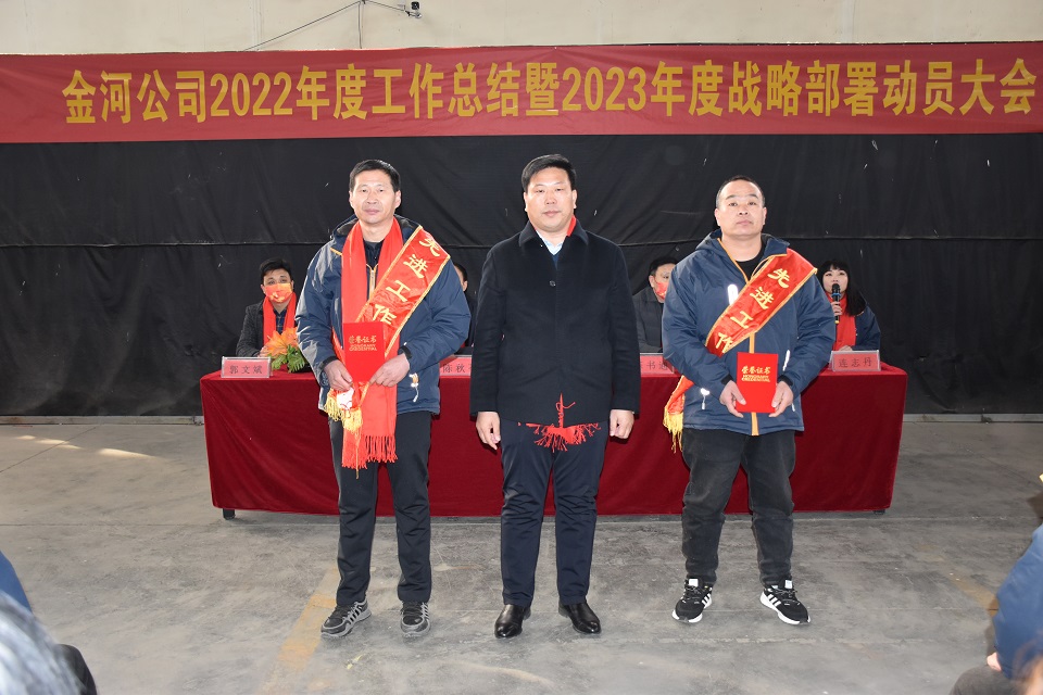 9:00分繼續進(jìn)入“金河公司2022年度工作總結表彰暨2023年度戰略部署動(dòng)員大會(huì )“,全體員工參加,公司高管與副總落座主席臺,會(huì )議包括表彰與總結兩項,表彰2022年度優(yōu)秀模范,號召全體員工向他們學(xué)習,首先頒發(fā)”援產(chǎn)模范“,由生產(chǎn)副總劉海峰頒獎;”援產(chǎn)干將“獎項由公司黨支部書(shū)記、總經(jīng)理陳文通親自頒發(fā)。最后陳總做總結講話(huà),回顧2022年走過(guò)的艱辛,感謝上級黨組織的關(guān)懷與支持,規劃2023宏偉藍圖,在美好的2023年打一場(chǎng)漂亮仗!為實(shí)現金河夢(mèng)中國夢(mèng)不懈努力!